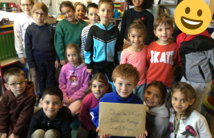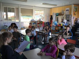 Il s’agissait des correspondants de l’école Georges Brassens de Chemillé. Depuis 2 ans la classe des CP, CE correspond avec une classe de CP/CE1 de cette école. Nous échangeons des courriers collectifs, des courriers individuels et nous nous rencontrons deux fois : une fois à Chemillé et une fois à Cossé !