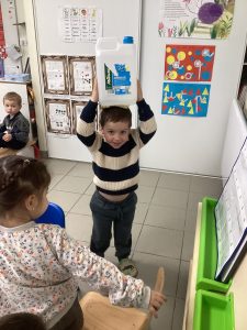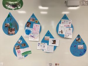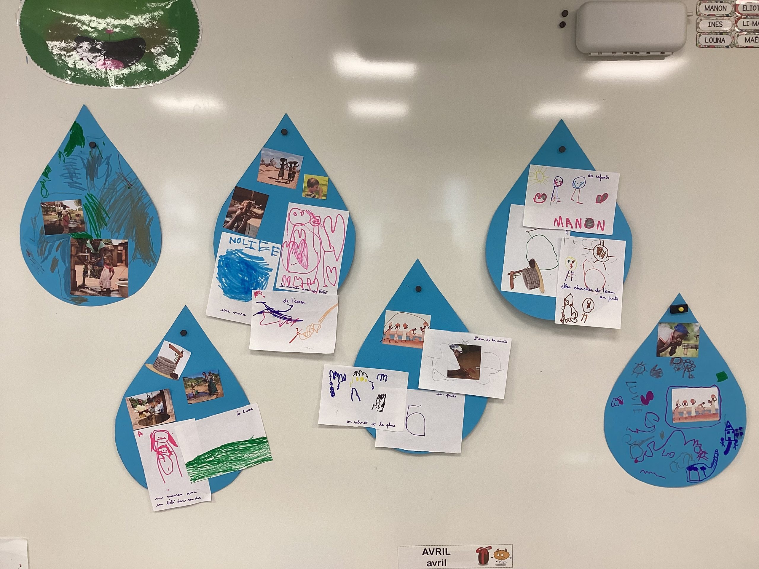 Cinq bénévoles de l’association sont donc venu nous parler de l’eau pour que nous puissions prendre conscience de notre chance d’avoir de l’eau au robinet pour boire ou se laver les mains, dans nos toilettes,… Nous avons découvert qu’en Afrique, il fallait parfois aller jusqu’à la rivière pour trouver de l’eau et qu’il fallait la porter sur sa tête dans des bidons ou dans de grandes bassines. Nous avons également découvert que des puits étaient creusés dans certaines écoles ou dans certains villages. Nous avons pu essayer nous aussi de porter de l’eau sur notre tête et nous avons ensuite décoré des gouttes d’eau avec ce qui nous avait marqué dans l’animation.
