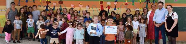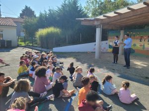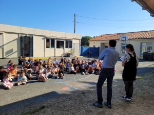 Vendredi 19 Septembre, au moment de la récréation, tous les élèves de l’école se sont réunis dans la cour pour accueillir Louise Briodeau, chargée de projet à Alisée, pour la remise du trophée. Luc Pelé, le maire de Cossé, était également présent pour l’occasion.