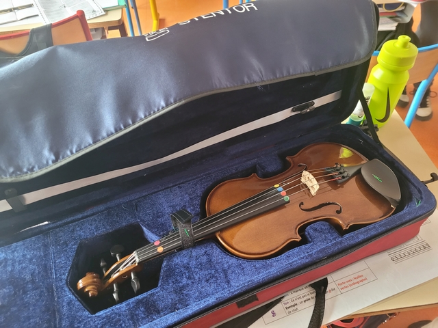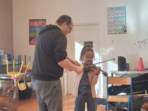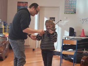 La semaine suivante, le 10 février, Emmanuel (professeur de violoncelle) est arrivé accompagné de Nans (professeur de contrebasse), Aniko (professeur d’alto) et Nathalie (professeur de violon). Après avoir appris comment rangé nos instruments, nous avons pu faire notre première séance d’apprentissage. Le soir, nous sommes repartis à la maison avec notre instrument.