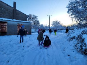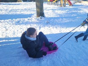 « On a fait des descentes en luge, c’était trop bien… la descente glissait bien et Ambre nous a tous tirés un par un ! » (Elise)