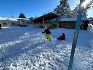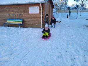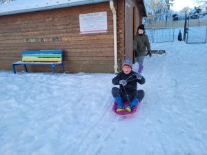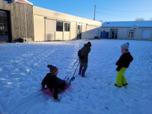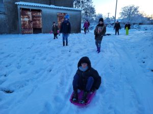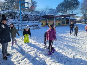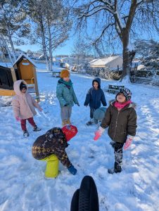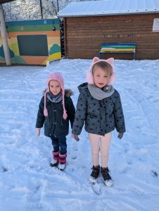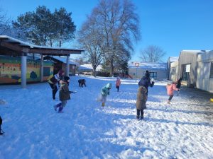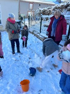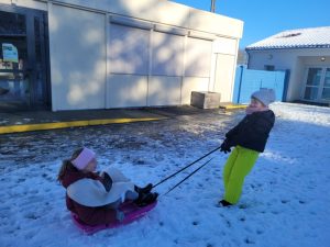 Les enfants qui habitent à proximité de l’école ont été accueillis par Charley, Isabelle, Géraldine et Maëwenn (stagiaire) et ont pu profiter des joies de la neige.