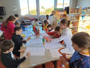 Ambre était venue avec sa luge. Les grands sont partis dès le matin vers le city stade et ont commencé à faire des descentes. Mais plusieurs d’entre eux, excités par cette nouvelle aventure, ont plongé trop vite avec délice dans la poudreuse… et se sont rapidement retrouvés frigorifiés ! Nous sommes donc revenus à l’école pour sécher les gants, les chaussettes, les pantalons… Au chaud, nous avons dessiné et fait des puzzles, puis Emmanuel de l’école de musique est arrivé pour la première séance de sensibilisation instrumentale.