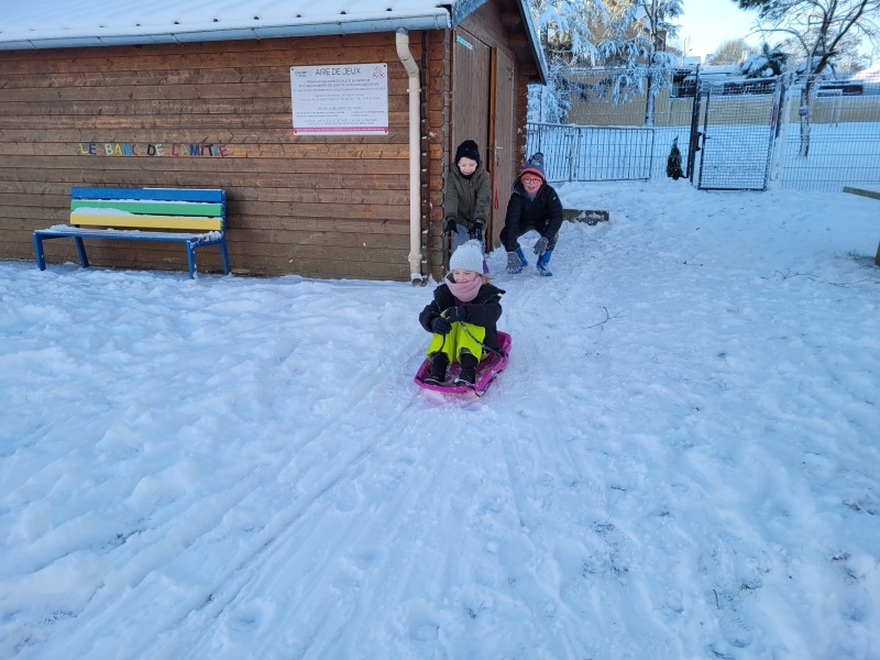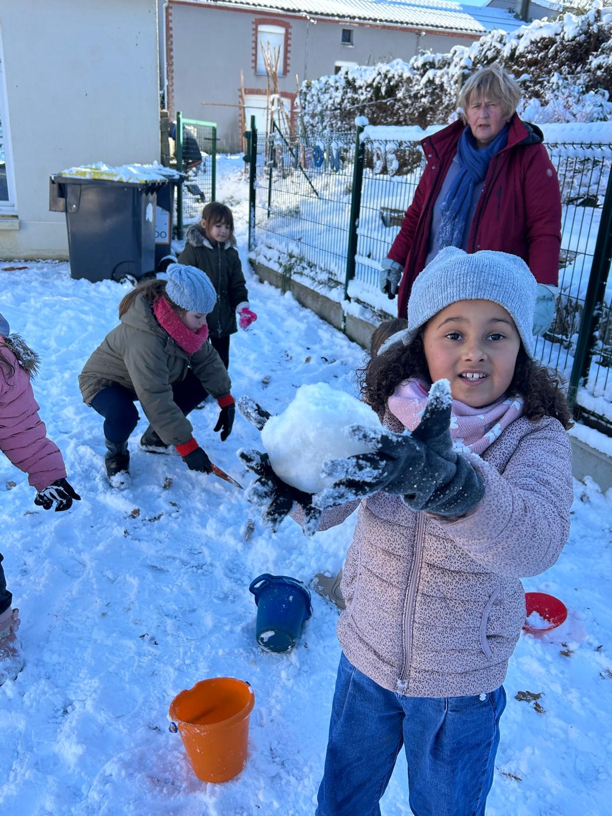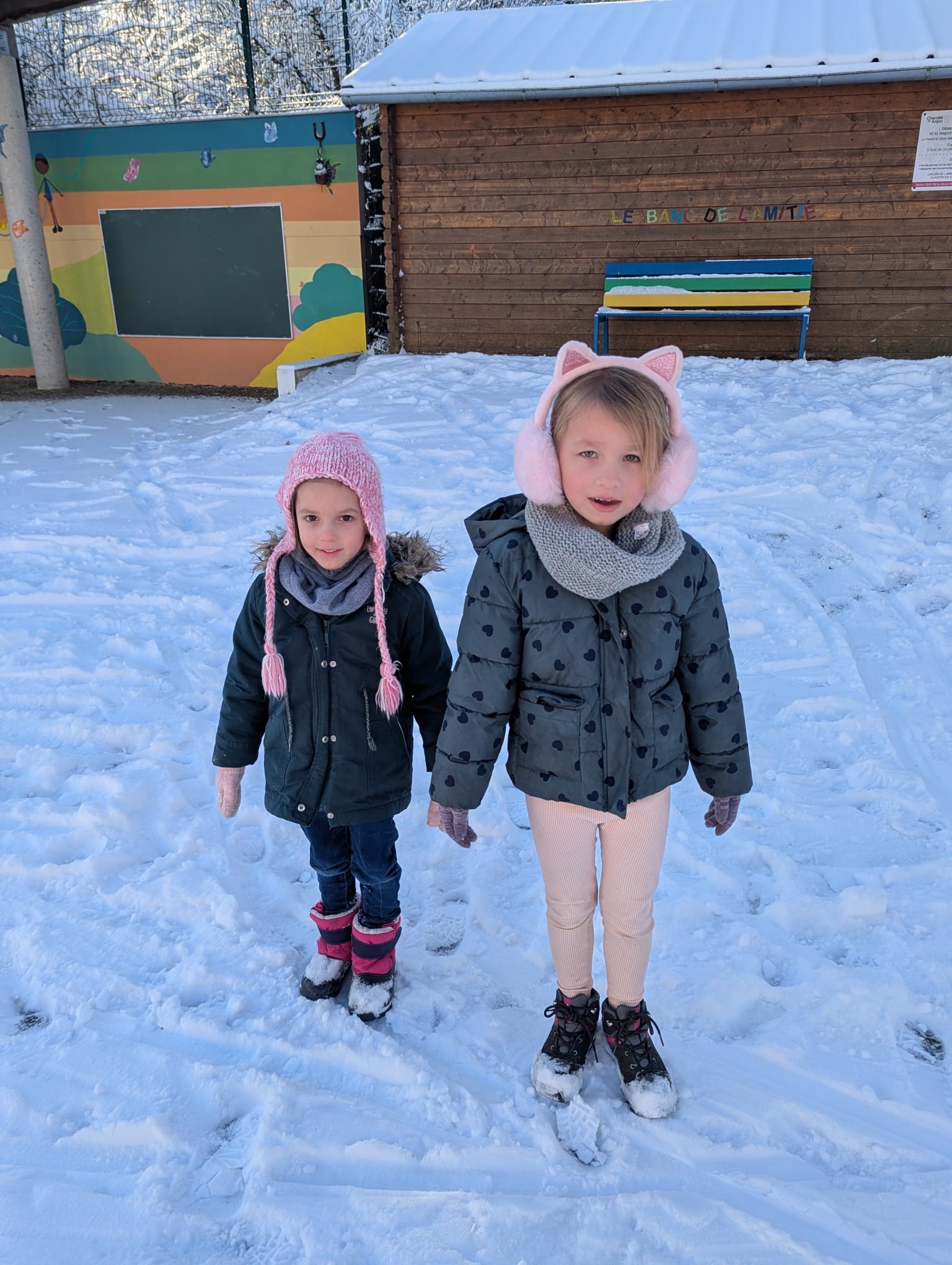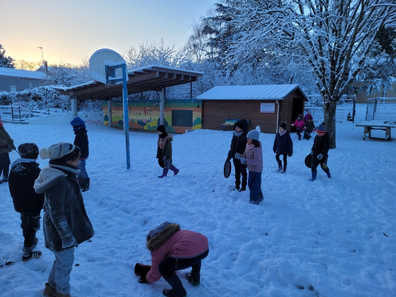 Bien secs et réchauffés, tout le monde a pu ressortir en dosant un peu mieux les contacts avec la neige : bataille de boules de neige avec le personnel de cantine, fabrication d’un bonhomme de neige (pas simple car la neige, très poudreuse, ne se colmatait pas bien), descente de luge, « anges de neige », assaut de boules de neige par les grands sur leur maitresse…