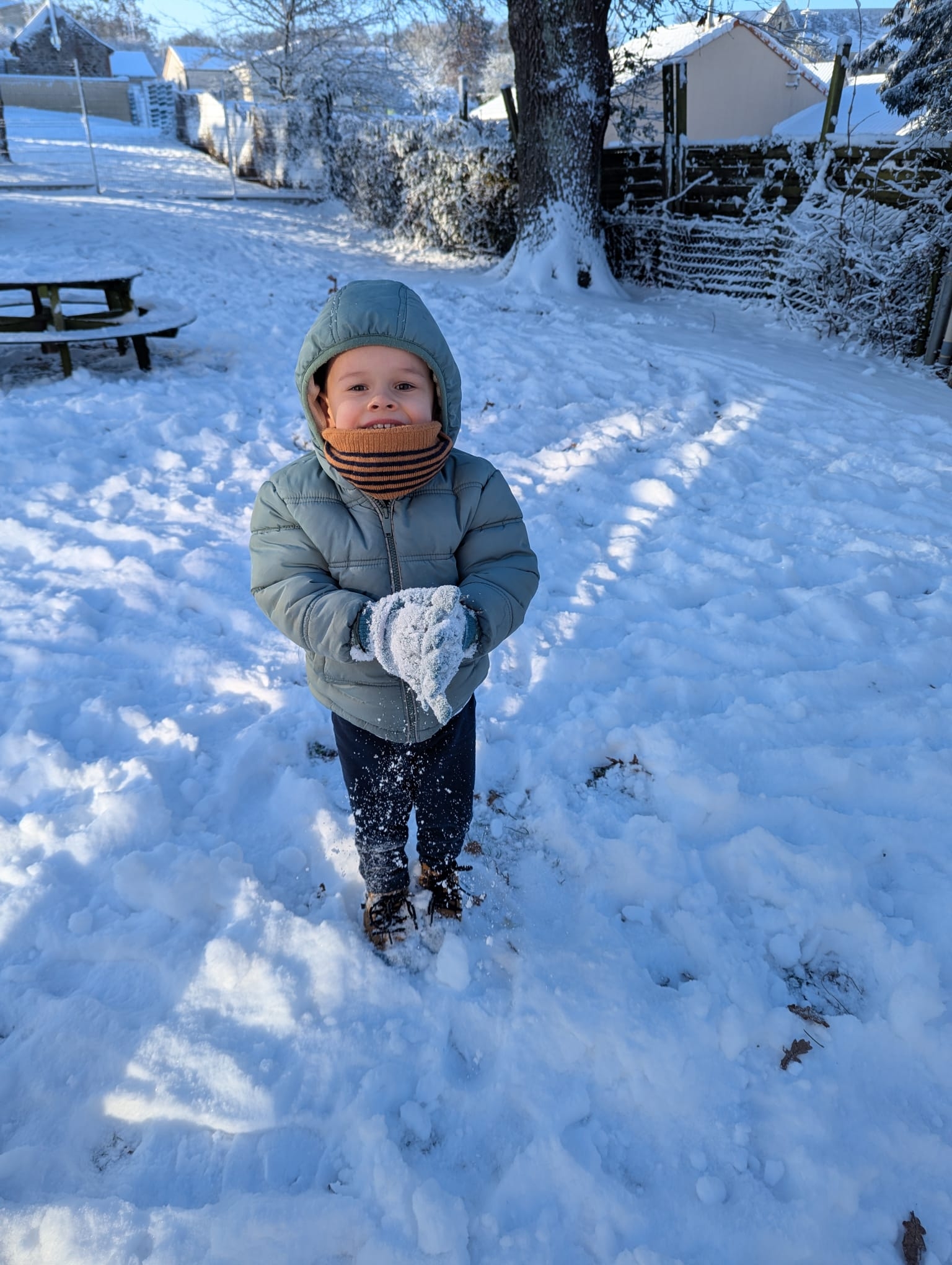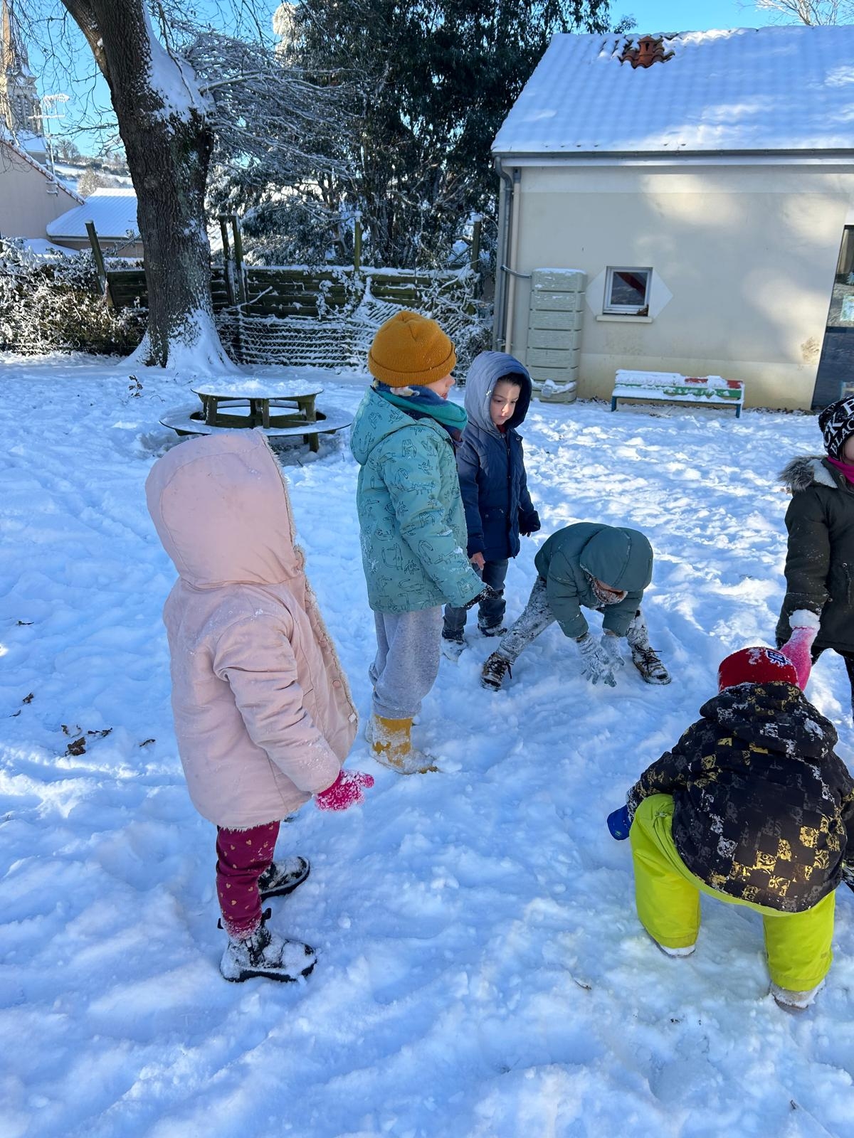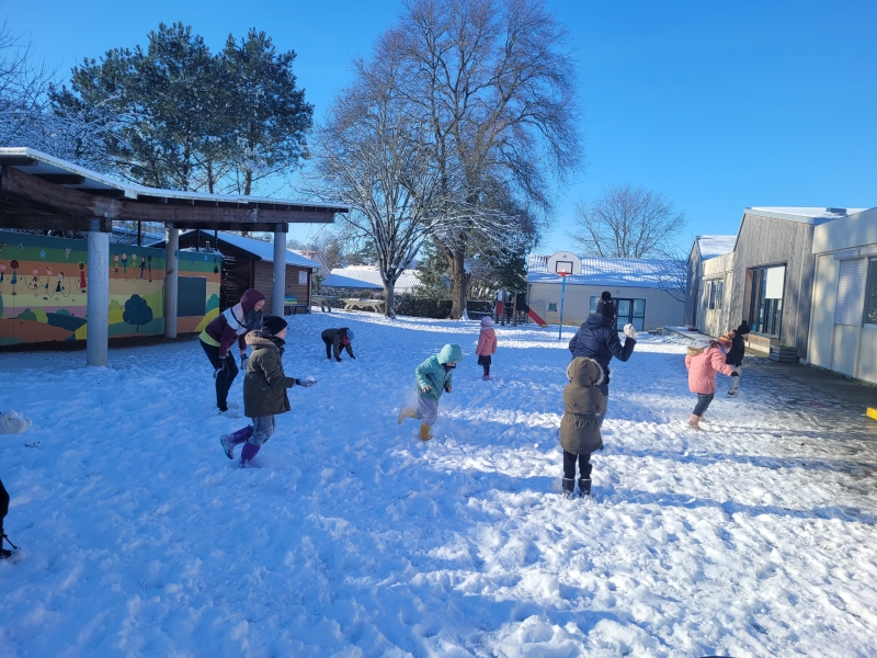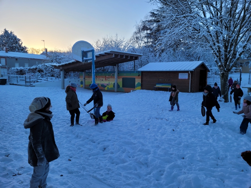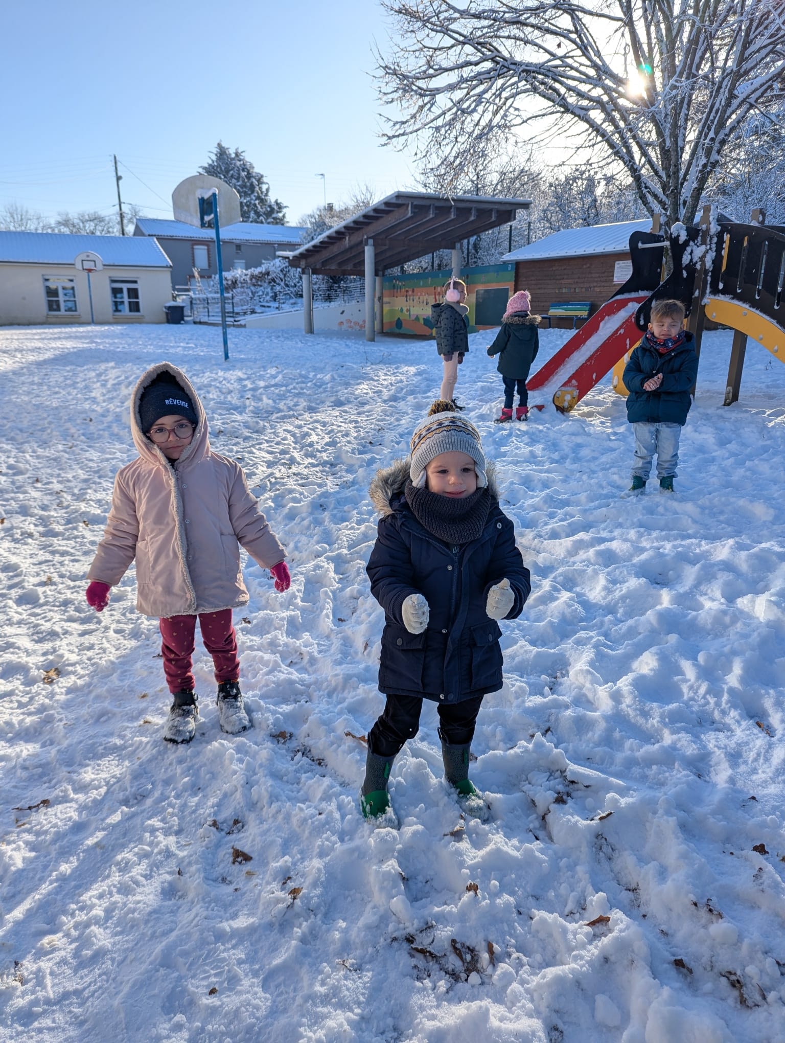 Bien secs et réchauffés, tout le monde a pu ressortir en dosant un peu mieux les contacts avec la neige : bataille de boules de neige avec le personnel de cantine, fabrication d’un bonhomme de neige (pas simple car la neige, très poudreuse, ne se colmatait pas bien), descente de luge, « anges de neige », assaut de boules de neige par les grands sur leur maitresse…