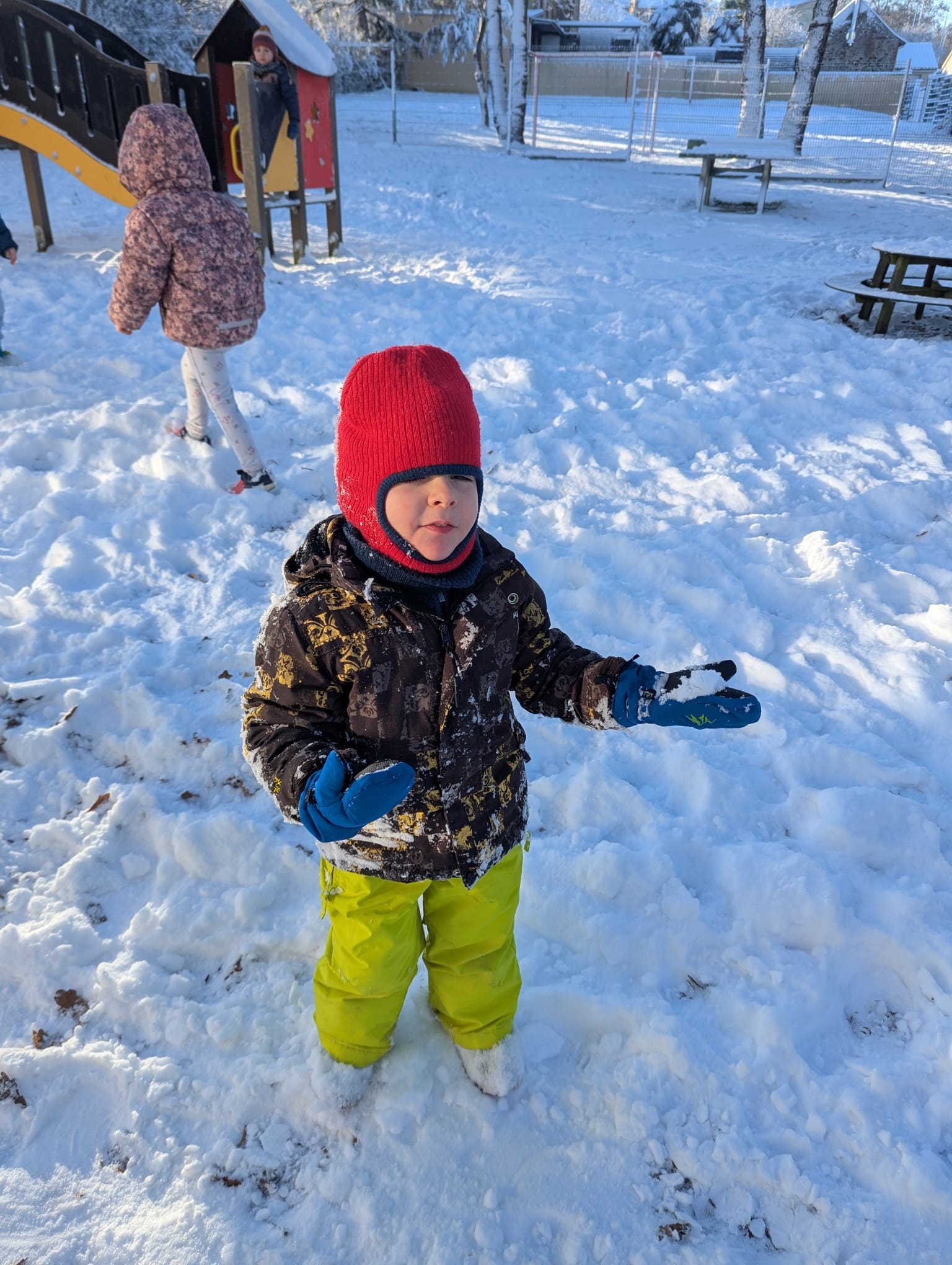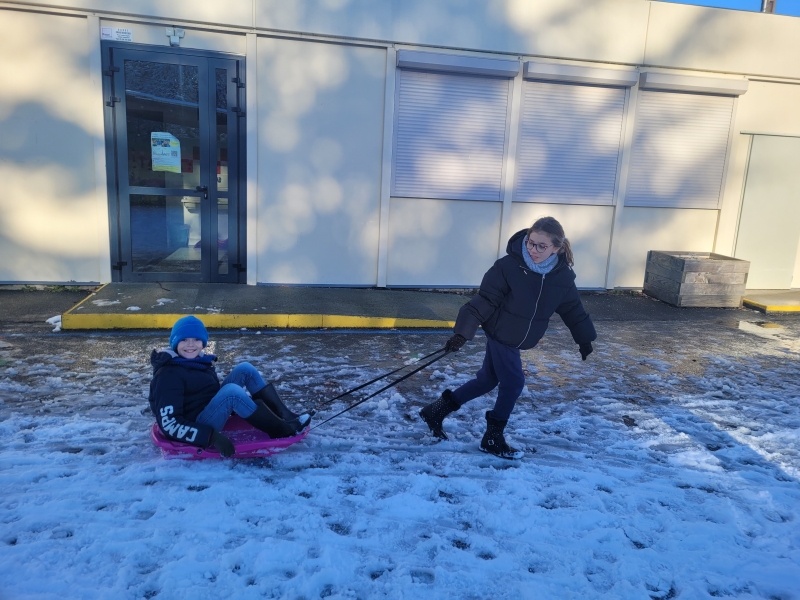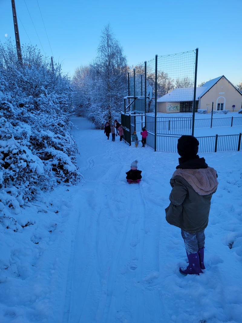 Les enfants qui habitent à proximité de l’école ont été accueillis par Charley, Isabelle, Géraldine et Maëwenn (stagiaire) et ont pu profiter des joies de la neige.