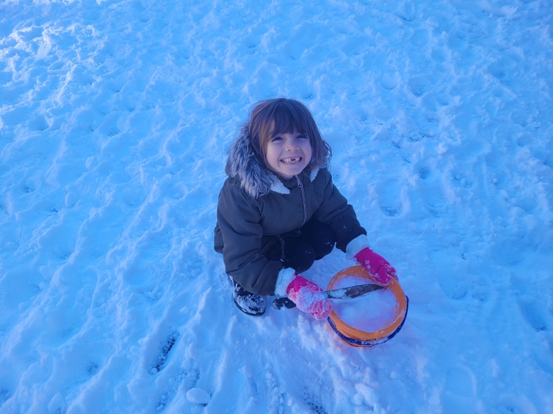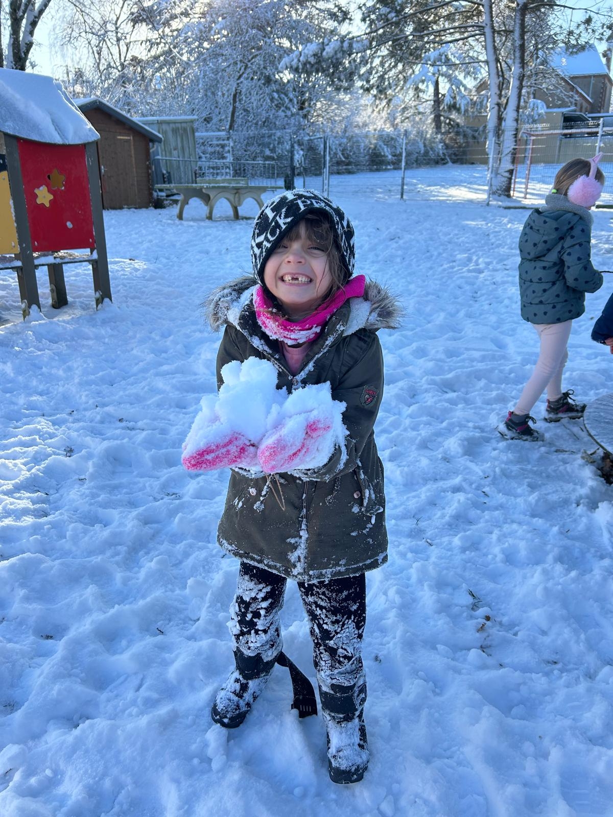 « J’ai aimé l’après-midi quand on a fait des batailles de neige avec les dames de la cantine. J’ai aussi aimé lancé des boules de neige sur Isabelle, elle était toute mouillée, on aurait dit un bonhomme de neige ! Je n’ai pas aimé le début de la journée car j’ai eu trop froid aux mains et aux pieds ! » (Elena)